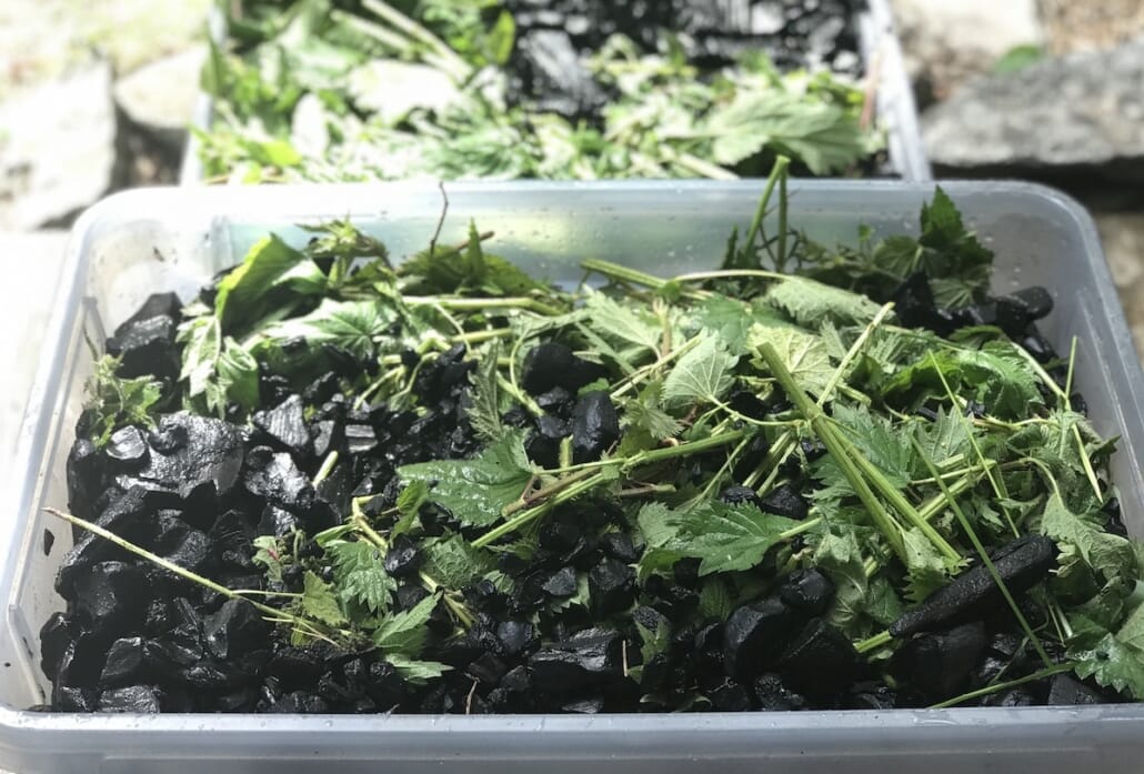 Vi skulle gjerne ladet kullet i bokashivæske, men så mye bokashivæske har vi dessverre ikke. Og den væsken vi har, vil vi heller gjødsle i kjøkkenhagen med. Derfor passer vi på når vi likevel skal lage neslevann! Vi tømmer biokull i bøtta først, og fyller deretter på med nesler og vann. For å hindre vond lukt av neslevannet, har vi også i Microferm og melasse. Vi fermenterer neslevannet! Da slipper vi også å røre i kassen (den skal bare stå i fred, lufttett med lokket på) og gjødselen vi lager blir betydelig mer effektiv. Les mer om Microferm og neslegjødsel