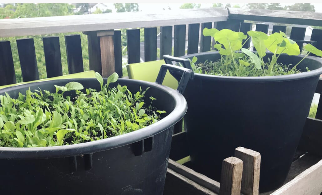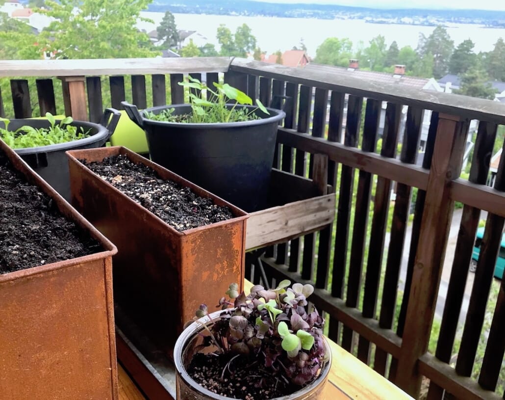 Mens vi venter på at biokull skal lades med neslevann og alle forkultiverte planter skal bi klare til å plantes om, dyrker vi mikrogrønt på balkongen. Vi tester også å seriedyrke i små dyrkekar. Seriedyrking kaller vi det når flere avlinger avløser hverandre på samme vokseplass, mange ganger i løpet av en sesong. Slik får vi mye ut av liten plass og sesongen blir kjempelang.