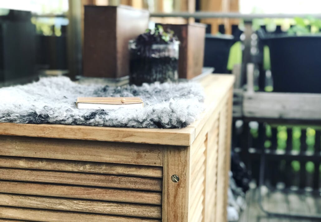Putekassen på balkongen vår inneholder sjelden puter. Vi legger ofte en sittepute på toppen i stedet: den er en sittekasse!