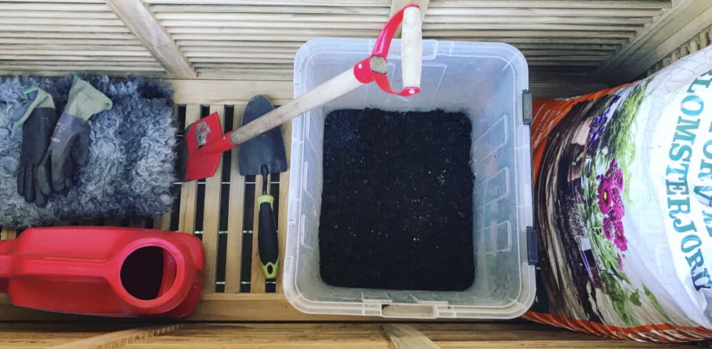 Men det er plass til mye annet: Det går 3–4 bokashi jordfabrikker i form av 30-liters kasser fra Nille i sittekassen vår. Det er genialt! Og likevel rommer kassen litt hageredskaper, vannkanne og eventuelt sitteputene da, på toppen.