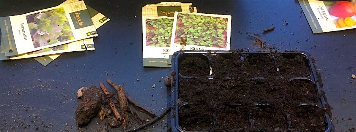 Det meste sår vi i spirebrett med lokk – det blir som små minidrivhus, og de fleste frø trenger litt god varme for å spire. Av jord tar vi det vi har. På sensommeren, i forbindelse med jordforbedring i kjøkkenhagen, bunkret vi jord i gamle jordsekker, som vi kunne blande med fermentert bokashi i ulike jordfabrikker gjennom vinteren. Vi bruker av denne jorden nå. Kvistrester og noen uomdannede kylllingbein fra bokashien solder vi ut. I tillegg har vi litt torvfri kjøpejord og bittelitt såjord i en sekk. Den fordeler vi på toppen, så blir det ikke for kraftig kost for frøene i starten. Frø trenger ikke næringsrik jord for å spire.