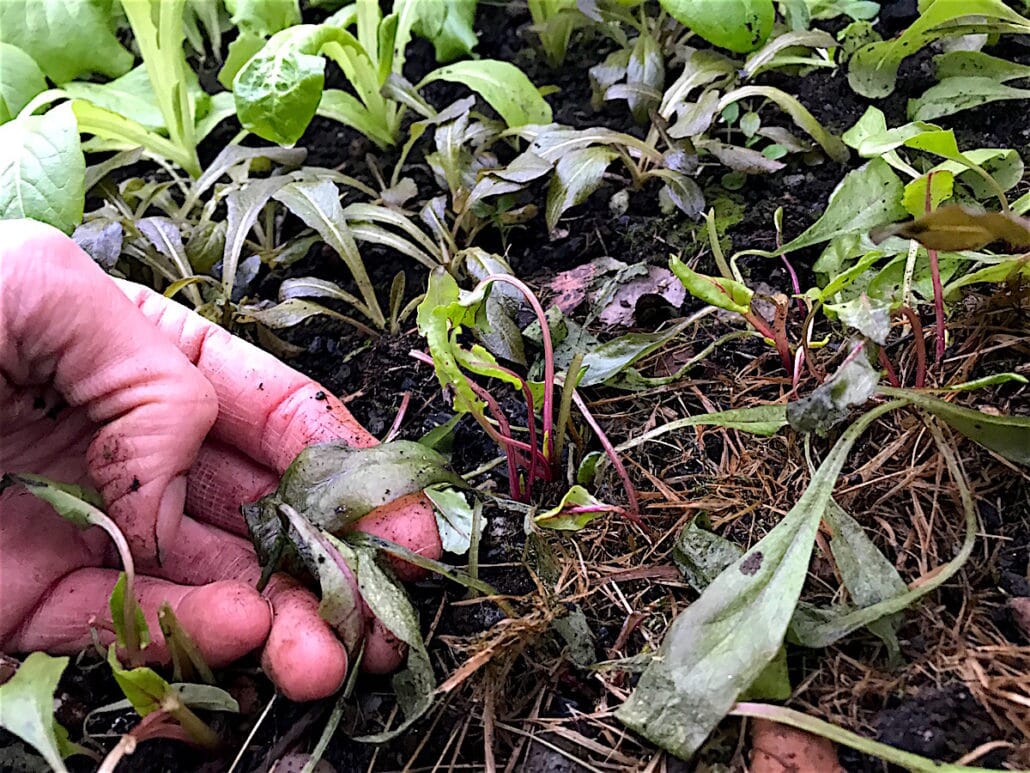 Klipp derfor ned og spis opp på høsten! La det stå igjen noe grønt til planten skal i gang og vokse igjen til våren, men klipp bort de største bladene. Det skal vi gjøre mye mer av før overvintring til neste år. Foreløpig står noen få spinat- og mangoldplanter som hederlige unntak i tunnelen, men de rokker ikke ved prinsippet.
