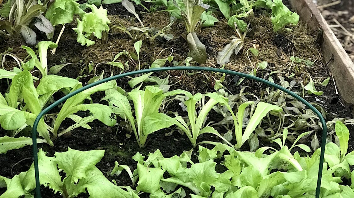 En del av salatbladene hadde fått frostskader og falt sammen i løpet av vinteren, de har vi plukket bort. Likevel synes vi det står utrolig mye fin salat tilbake i bedet når lyset endelig begynner å ta seg opp i midten av februar. Det er nå de overvintrede småplantene forhåpentligvis skal begynne å vokse igjen. Så vi får spiseklar salat om bare noen uker!