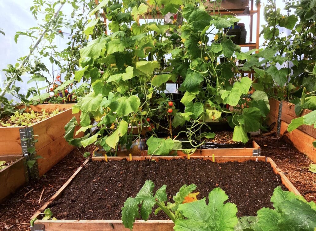Da har vi jordfabrikk i drivhustunnelen – for en ressurs! Vi er storforbrukere av bokashi på denne tiden av året. Etterhvert som vi høster og spiser som grever, graver vi bokashi og hageavfall i jorden. Slik får vi levende jord som er rik på næring og energi, og som mark og mikroorganismer stortrives i. Når jorden har fått sitt, sår vi på ny, eller planter ut det vi har sådd i plastbokser og pluggbrett mens kjøkkenhagen fremdeles var full.