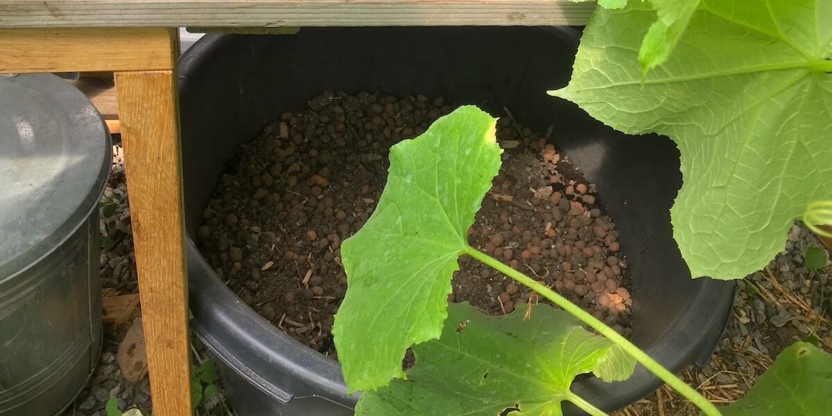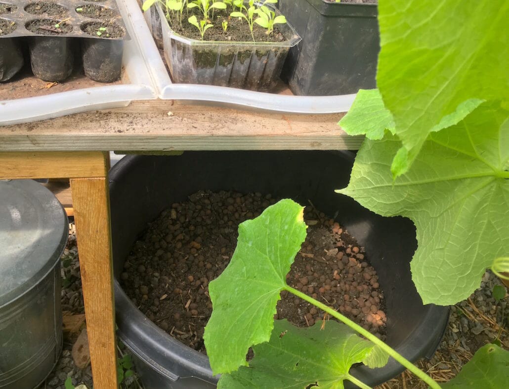 Vi har brukt en diger murerbøtte på 90 liter! Men det kunne godt ha vært et par pallekarmer, eller en mindre bøtte eller kasse – da ville den også vært enklere å flytte med seg rundt for å toppgjødsle. Kanskje vi lager en mindre variant også. Hadde vi hatt et ledig hjørne i veksthuset, hadde vi satt ned pallekarmer der som kunne stått rett på jorden og lokket til seg masse meitemark og liv i jordfabrikken. Men det har vi ikke, så for oss passer det bedre med en flyttbar variant. Bøtta får akkurat plass under arbeidsbordet i drivhustunnelen – det eneste stedet hvor vi ikke dyrker noe for øyeblikket.