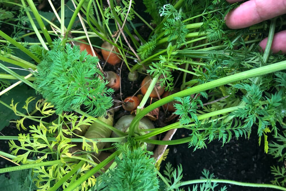 – Det er vel ikke noe grensesprengende triks, men jeg liker best å ha en dedikert jordfabrikk med luke nederst, der jeg kan forsyne meg av modnet kompost, istedet for å grave ned matavfallet direkte i bedene. Jeg syns det er mest praktisk. Da kan jeg hente kompost når jeg trenger, og legge rundt plantene. Da lar jeg regnet og meitemarken ta seg av gjødslinga over tid. Ved å legge kompost på toppen kveler jeg også ugressfrøene. Det lokker også opp meitemarken. Den kommer opp, henter kompost, og går ned og bæsjer den ute nede der røttene er. Samtidig lager de fine kanaler i jorda som planten kan sende røttene sine ned i.