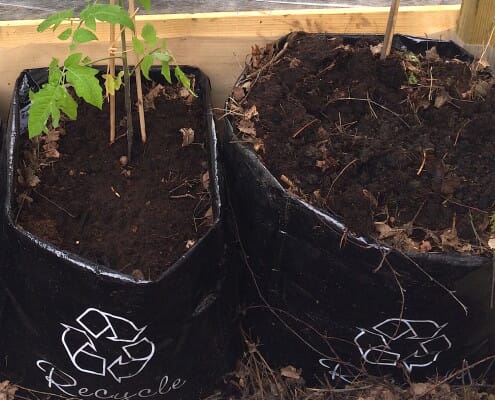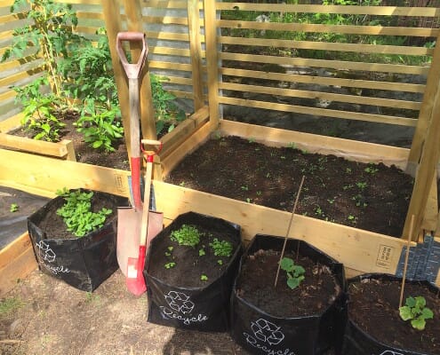 Løsningen ble dyrkesekker. De rommer mye jord og er sterke. De er også mye lettere å flytte omkring på enn tunge krukker, så du kan flytte dem etter sola og bort fra vinden om du ønsker det. Eller bort til naboen som skal være vannevakt mens du er borte på ferie.