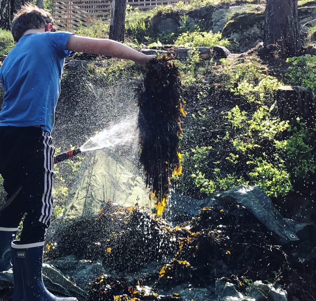 Til de nye frilandsbedene tok vi turen ned til sjøen og hentet et par trillebårlass med tang; en ganske kald fornøyelse i slutten av april, men det var det verdt!