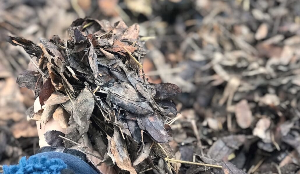 Vi samler også løv i sekker på høsten. Løv som har ligget på bakken, inneholder masse fine jordbakterier og er supert til å drøye jordforbrukket i bokashi jordfabrikkene vinterstid. Løv fryser ikke skikkelig heller, så sekkene kan fint stå ute – det er likevel lett å krafse løs løv når vi trenger det. Våren 2019 hadde vi et par store sekker igjen. De er supre å lage jord av! Det ble et tykt lag med løv i bedene.