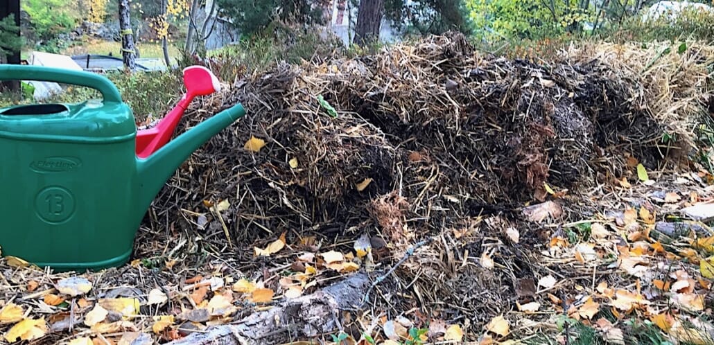 Dette halmmaterialet er gjennomtrukket av hønsegjødsel, som er nitrogenrikt og skikkelig krutt i hagen! Men det er «sterkt» og et vanlig råd er å la fersk hønsemøkk kompostere et halvt–et år før den blandes i hagejord. Vi pleier å la den «komposteringen» foregå rett på vokseplassen: et stykke nedi bed og pallekarmer, slik at vi ikke dyrker direkte på denne gjødsla med det samme.
