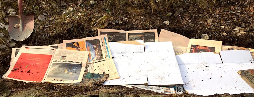 Bunndekket med aviser la vi allerede om våren på stedet der det nye bedet skal være. Vi har tidligere testet å bygge halmballhage, og da gjelder akkurat samme prinsippet for kveling av ugress: raust med papp og aviser i bunnen. Året etter er altså grunnlaget for det nye frilandsbedet allerede lagt, og vi har massevis av herlige halmballhage-rester å lage jord av.