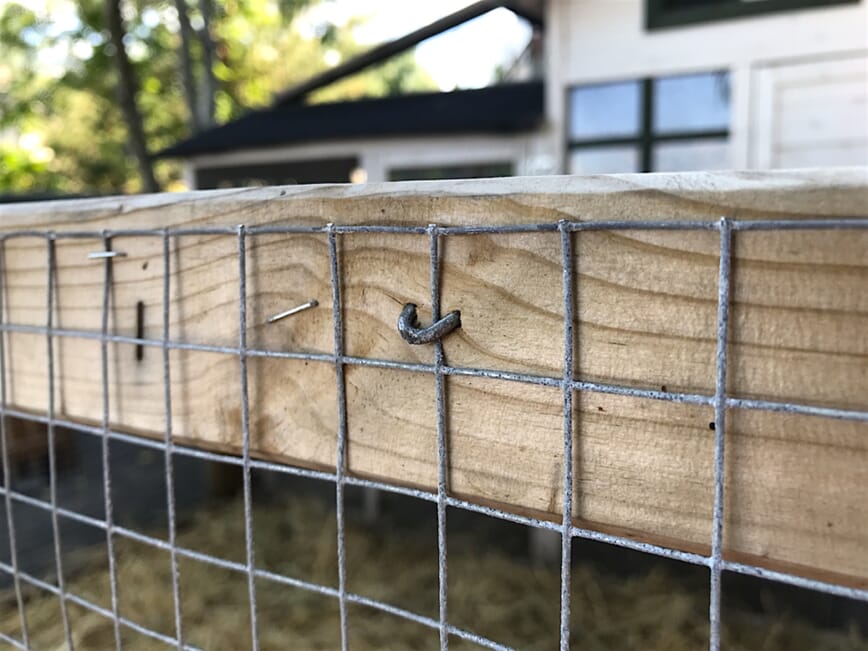 Akkurat, tenkte vi. Takk! Selv om nettingen i og for seg holdt hos oss – den var ikke revet i stykker – er hønsenettingen tynn og bøyelig. Det er lett å få mye «sving» på den om den blir revet i. Vi hadde dessuten stiftet den fast med trestifter. De er ikke rustfrie, og de holdt ikke etter to år. Vi måtte ut og skaffe revenetting. Og skikkelige kramper som kan hamres inn med hammer.