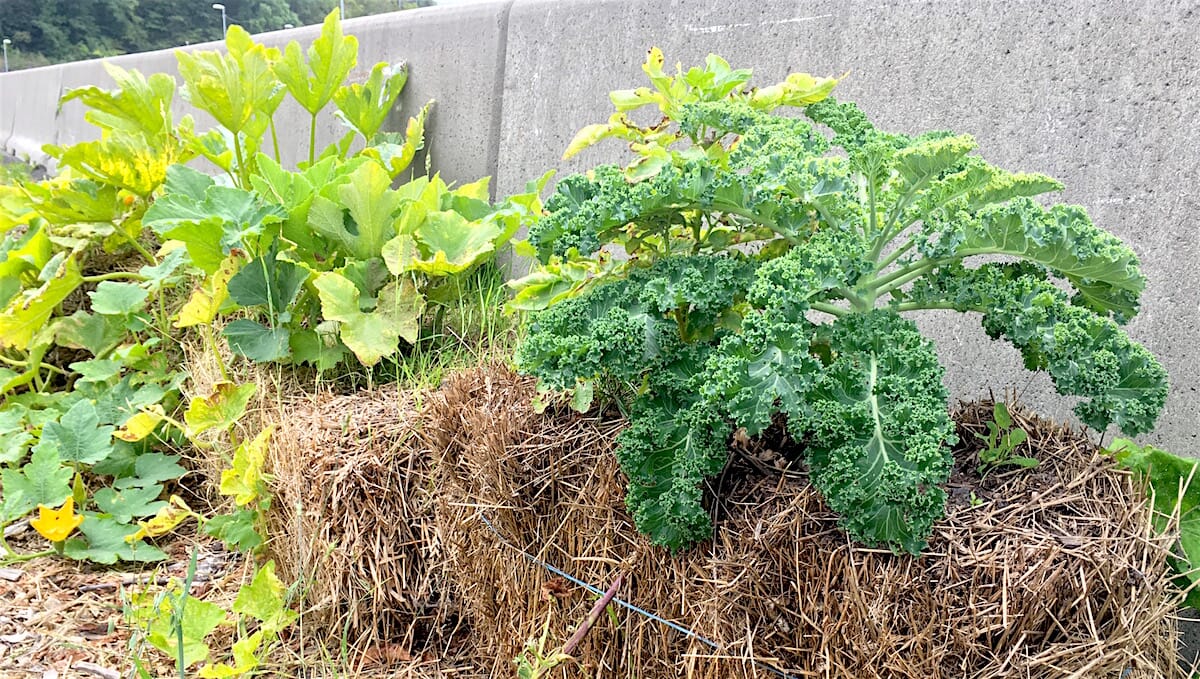 - Plant ut forkultiverte planter i jorden. Andreas har dyrket næringskrevende planter som gresskar og squash i halmballene i sommer, i tillegg til en del annet.