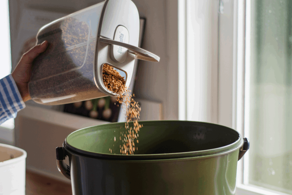 Du trenger en beholder med lokk på kjøkkenbenken hvor du kan samle opp matavfall i løpet av dagen, slik at du kan tømme i bokashibøtta bare én gang daglig. Bruk for eksempel en gammel isboks, kommunens kjøkkenbeholder for matavfall, en krukke med lokk eller avfallsbøtten BioProffa.