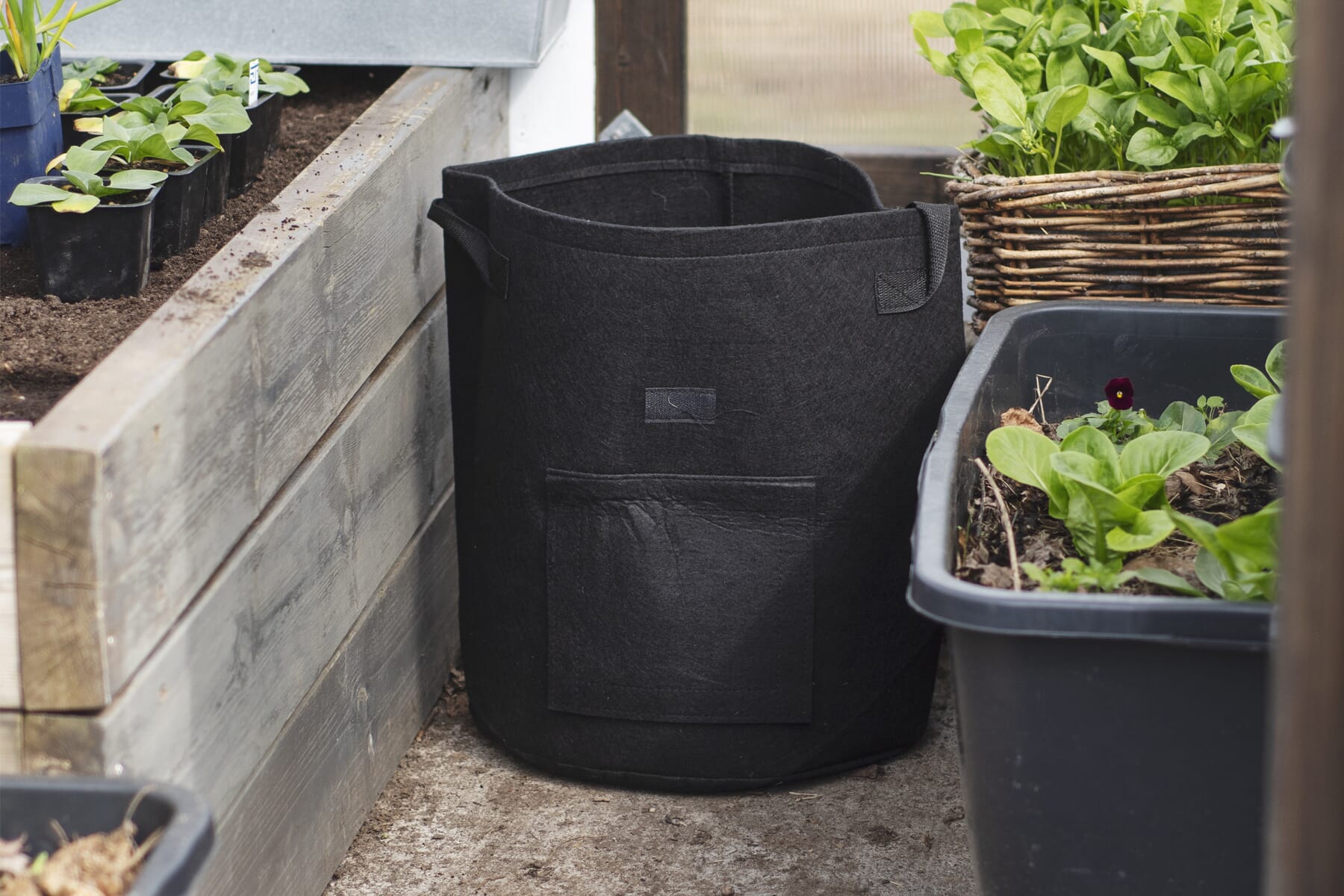 Du kan heller ikke overvanne i en dyrkesekk. Såfremt du ikke har plassert dyrkesekken din på et vanntett underlag med kanter slik at vannet ikke kan renne unna, så vil alt overskuddsvann renne ut og forsvinne. Dyrkesekken kan med andre ord stå ute i pøsregn uten at du behøver å passe på hvor våt jorda blir eller helle av potteskålene. Og fordi vannet slipper ut gjennom stoffet – ikke gjennom hull på undersiden – så forblir all jorda i sekken.Hvordan dyrker jeg i en dyrkesekk?