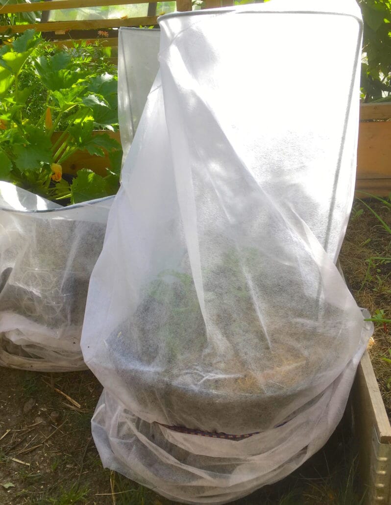 Vi har et hat/elsk-forhold til fiberduk. De er rimelige og nyttige (for eksempel som beskyttelse mot nattekulda om våren), de slipper igjennom bra med lys, og vi vil ikke egentlig unnvære dem. Men de går også fort i stykker og er upraktiske å åpne og feste igjen daglig (minst!) for å vanne og høste.