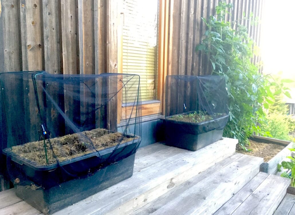 Så til to store plantekar på terrassen (egentlig jordfabrikker fra i høst/vinter) bestilte vi insektnett for tvillingvogn! Nettene har strikker nederst og er superenkle å åpne og «lukke». Vi bruker støttebøyler til å holde disse også oppe, og foreløpig får både reddiker og ruccola vokse i fred under hvert sitt insektnett.