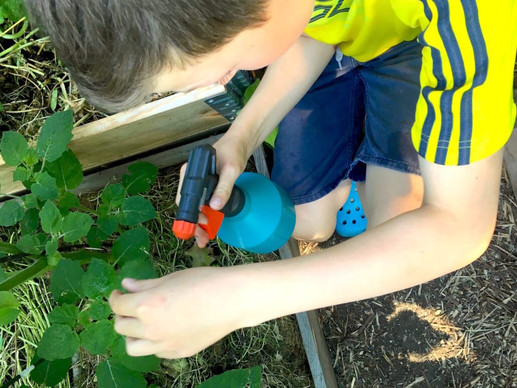 Deretter fikk de lusbefengte plantene en ny runde med spruteflaska: med bare bokashivæske og vann denne gangen. Vi klemte, sprutet og gned.