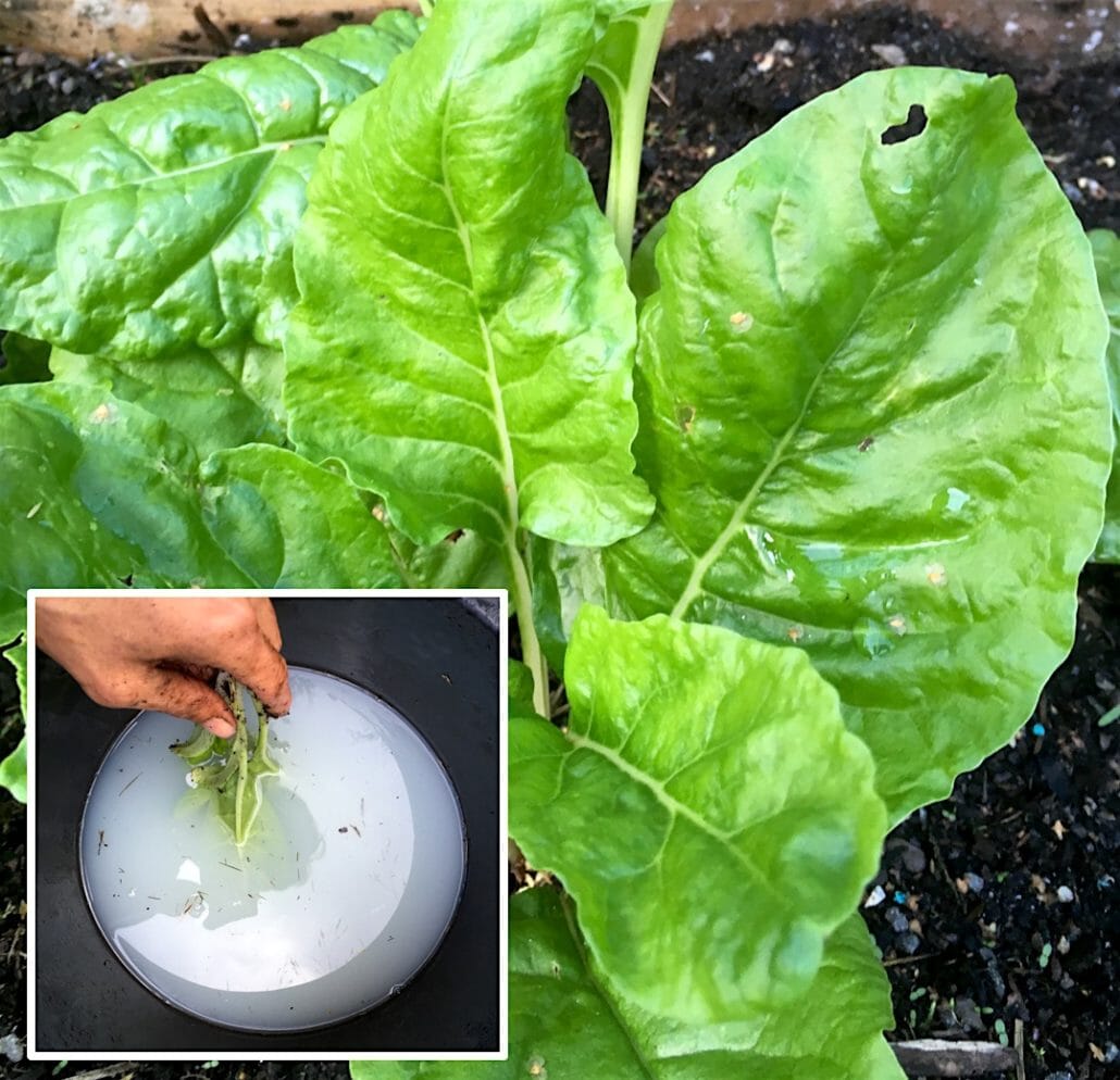 Vi var slett ikke sikre på om de kom til å tåle behandlingen, men to uker senere vokser de sommersådde mangoldene så det knaker. De er kraftige og mektig grønne, som Mangold av typen «Fordhook Giant» skal være. Og uten lus.