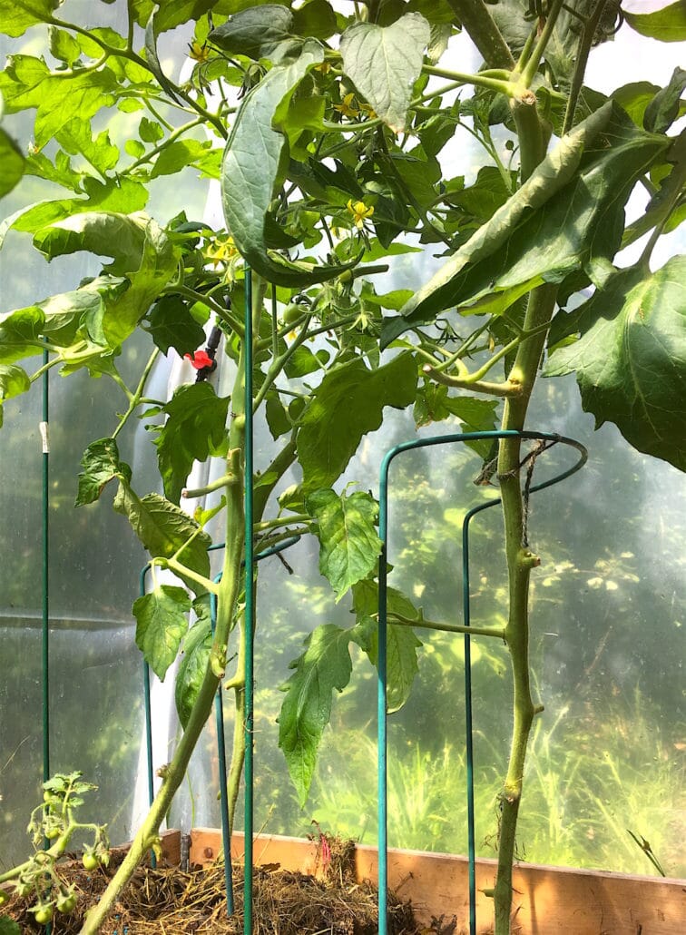 Fra sarabackmo.no har vi lært å beskjære tomatene. Dyrker du tomater i bokashi-jord får du lett kraftige tomatplanter, som har veldig godt av å beskjæres litt – da får du også veldig mange, gode tomater på dem. Med bladlus på tomatene får vi dessuten færre blader å følge opp når vi beskjærer plantene. Så det gjorde vi.