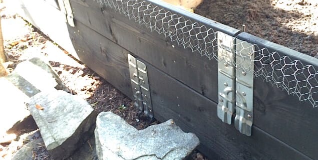 - Vi målte omkretsen av kassene og brukte en avbitertang til å klippe over rullen med hønsenetting i stykker som var ti ruter ”høye”. – Mange nok stykker til å rekke rundt hele, med litt overlapp. Bruk arbeidshansker når du jobber! Hønsenetting sliter på hendene. Kanskje kan du bruke enda «høyere» biter, for å få enda bredere lister. Vi tror som sagt det er størrelsen det kommer an på.
