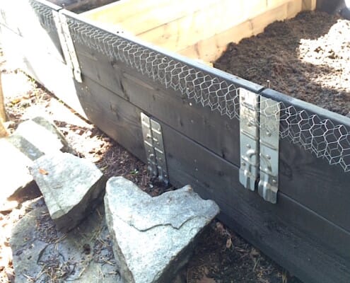 Inspirert av ulike sneglegjerder/ sneglelister i stål og jern som finnes til salgs her og der, bestemte vi oss for å forsøke å lage våre egne. Av hønsenetting. Vi testet først ulike løsninger på salat- og urtekassene i sør-veggen hvor vi hadde plukket noen snegler i løpet av sommeren. Den vi endte opp med å montere der, er grunnere enn den på bildet; og det ser ikke ut til å ha vært godt nok. Vi plukket 3–4 snegler på salaten også etter at vi monterte lister av hønsenetting der. Løsningen på bildet har imidlertid fungert hos oss. Det tror vi i alle fall: Vi hadde ikke noen snegler i kassene, selv om vi plukket noen på bakken omkring. Slik gjorde vi:
