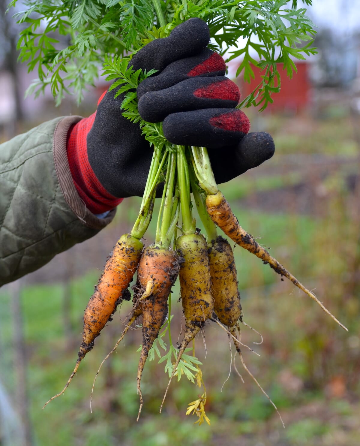 – Disse rødbetene plantet jeg i begynnelsen av september. De er supergode, jeg bruker også stilkene til pesto. Salat skal jeg ha med hjem til lørdagsmiddagen og gulrøtter, sier hun og tar opp en liten bunt.