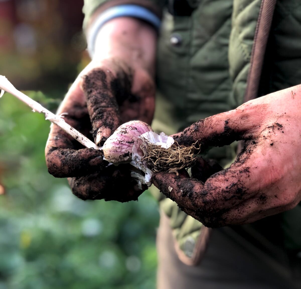 På parsellen til Cecilie står duggfrisk grønnkål i rikt monn. Denne lørdagen tar hun opp store, fine neper som skal på helgemenyen, og planter hvitløk.