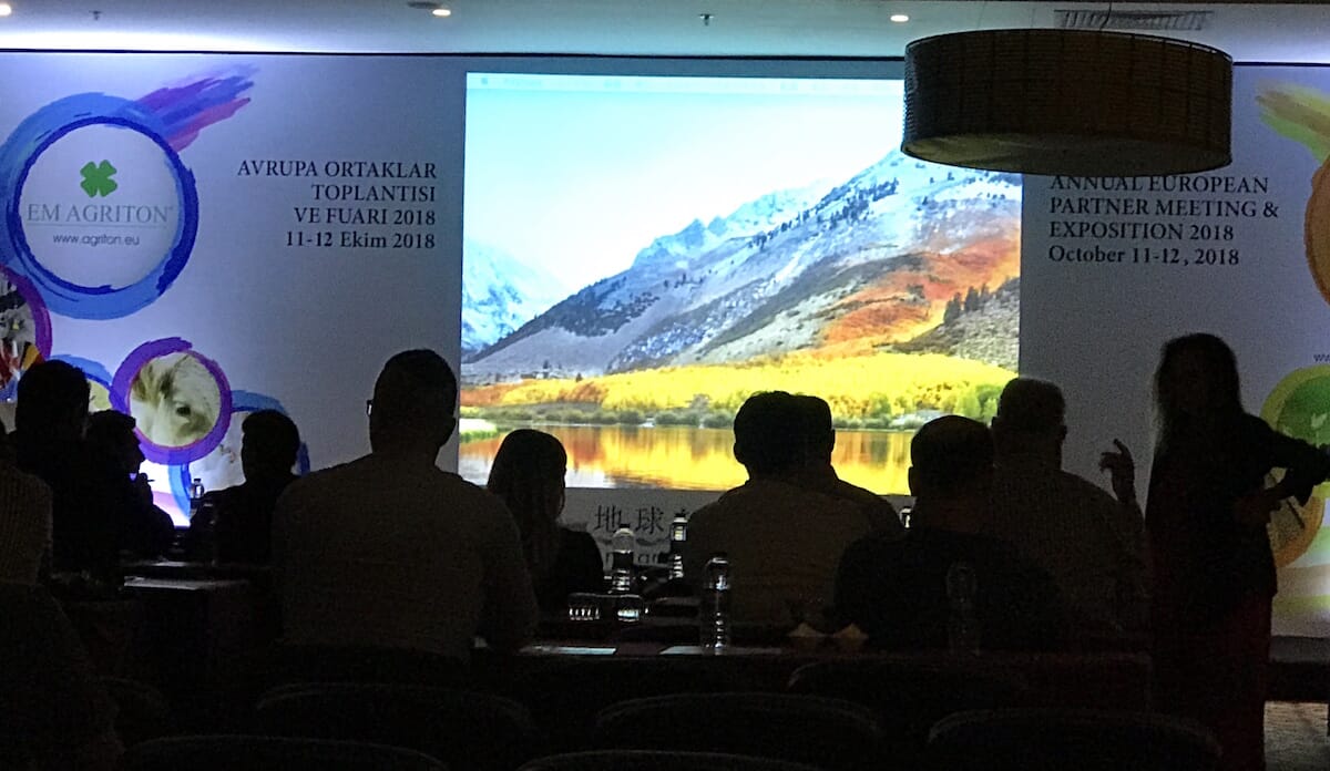 Den bakteriekulturen, eller mikrobeblandingen, som er virksom i bokashi, heter EM. EM står for Effektive mikroorganismer. I oktober 2018 var produsenter, importører og forskere på EM fra hele 28 land i Europa samlet til kongress i Tyrkia. Noen er små og relativt nystartede, som oss. Andre er mellomstore bedrifter med noen titalls ansatte, like mange år i gamet, og mange, mange forhandlere i hjemlandene sine. De har tusenvis av brukere med årelange erfaringer og milliarder av mikrober i arbeid – på store gårder, i titusenvis av hager, i storskala-fjøs og på digre plantasjer. Det gir trygghet. Vi er ikke alene.