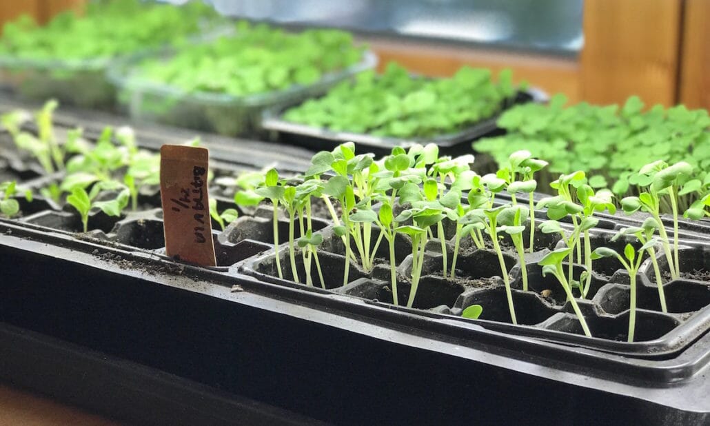 Da vi plantet ut i benken 10. februar, holdt vi igjen en del småplanter. Noen av bataviaplantene på bildet over – og en del ruccolaspirer og småplanter av pak choi – fikk være med inn igjen. De står fortsatt under vekstlysene i vinduskarmen og vokser fint. De er vår ferie-backup. Hvis Kong vinter har tatt kverken på plantene i varmbenken når vi kommer hjem, håper vi at vekstene i vinduskarmen har klart seg, så slipper vi å begynne helt på nytt med alt ute i benken.