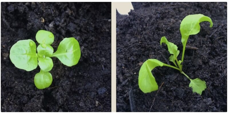 Vintersalat og ruccola sår vi i den samme raden: vintersalat spirer ganske sent, mens ruccola både spirer og vokser raskt. Så vi satser på høste ruccolaen før vintersalaten trenger mer plass i raden.