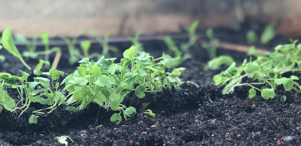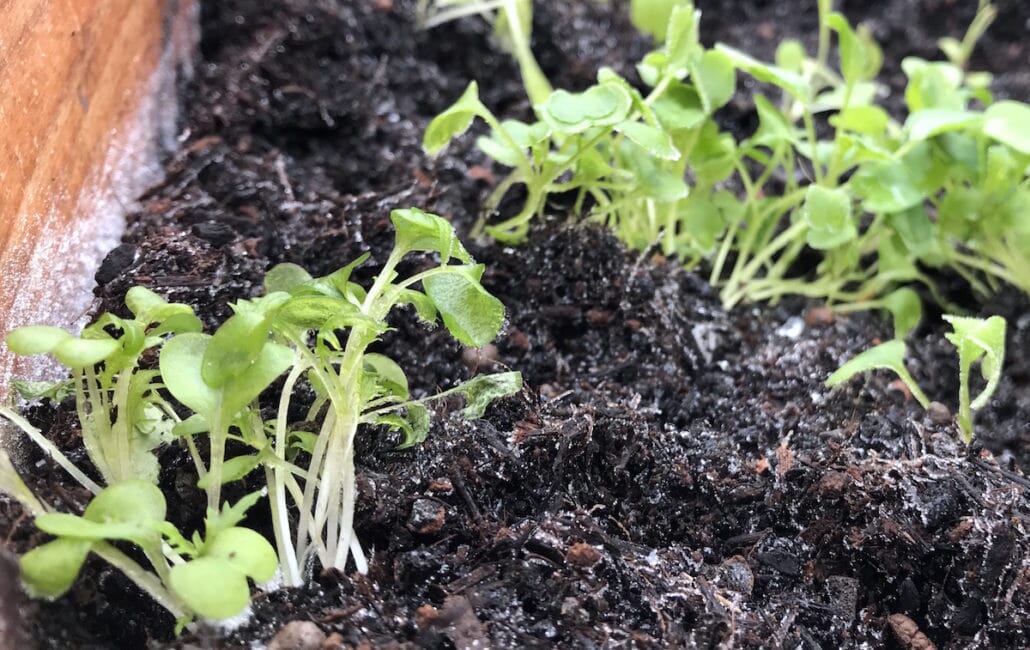 2. Vi har back-up. Da vi plantet ut forkultiverte småplanter i varmbenken 10. februar, visste vi at det var tidlig. Vi tok noen planter av bataviasalat, ruccola og pak choi med inn i vinduskarmen igjen. De har stått under vekstlys og vokst forsiktig frem. De er vår back-up og kan erstatte planter som eventuelt måtte fryse i stykker i varmbenken, eller frysebenken, som vi kaller’n nå.
