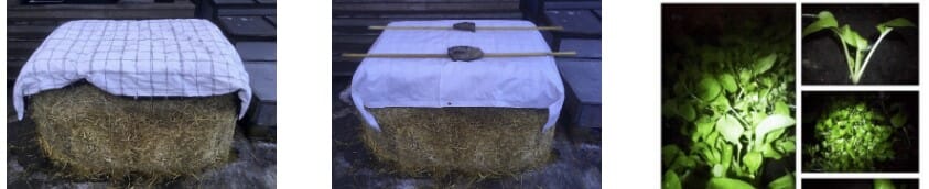 Det nærmer seg to uker siden vi fylte varmbenken med hestemøkk og halm, og over en måned siden vi begynte å forkultivere/ så frø innendørs. Siden da har vi vannet både inne og ute: spirene under vekstlysene i vinduskarmen har vi vannet forsiktig ved behov, og varmbenken har fått en bøtte varmt vann daglig i en drøy uke etter at den var fylt opp. Slik sikret vi at den fikk opp dampen. Forøvrig har den stått tildekket av en dyne (pledd eller andre typer dekke går også bra) og presenning til nå.