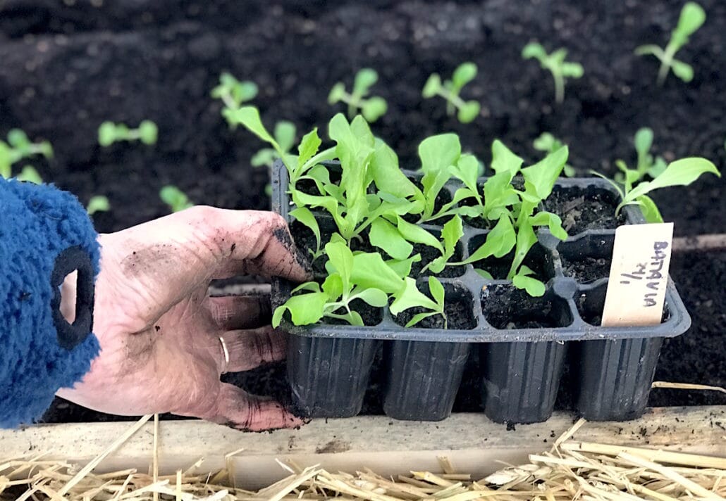 Det er kaldest ut mot kantene av benken. Det tar vi hensyn til når vi planlegger hva vi setter eller sår hvor. Det meste vi velger å dyrke i varmbenk, tåler en del kulde, men reddiker kan være litt ømtålige. De sår vi i midten. Og så går det slag i slag ut mot kantene: pak choi og batavia, ruccola og mizuna. Ytterst mot hver kortside sår vi brønnkarse og salatfavoritten Little Gem. Begge tåler en del kulde, dessuten tar det noen uker (og våren rykker nærmere) innen frøene spirer. Da er det forhåpentligvis blitt varmere i været.