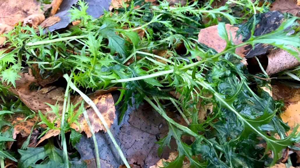 Brønnkarse, mangold og mizuna hadde stått fint ute veldig lenge i år. Mangolden i tunnelen rakk vi å lage pai av etter at frosten bet tak i den. Deretter klippet vi den ned og dekket til plantestubbene med fiberduk og plastlokk for overvintring i drivhustunnelen. Alt vel. Men i kjøkkenhagen gikk det med noen pallekarmer med brønnkarse og mizuna. Det er kalkulert risiko hos oss.