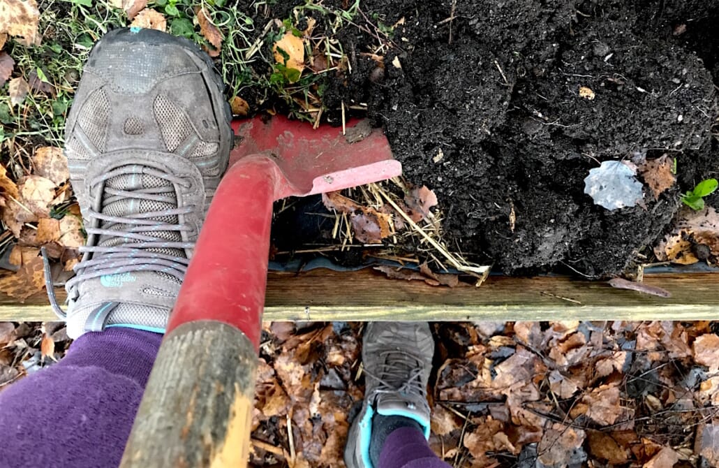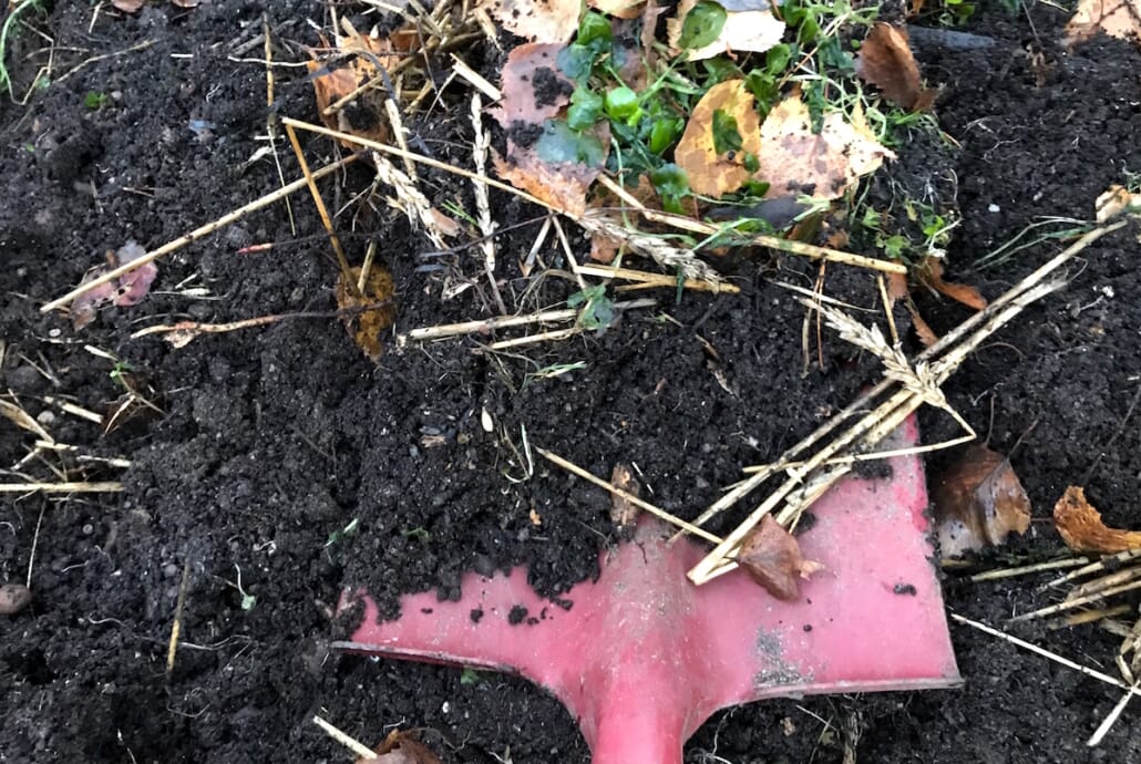 Desember er travle tider og det var vått og kaldt ute, så vi gikk for raske løsninger. Vi gjorde rett og slett en enkel snuoperasjon. Pallekarmene med frostskadet mizuna og brønnkarse var allerede toppet med høstløv som hadde funnet veien dit selv. Alt sammen er supert å mate jorden med: Herlig organisk materiale som gir fin struktur og rikt mark- og mikroliv. Med noen enkle grep med spaden snudde vi ganske enkelt det øverste laget i pallekarmene opp-ned. Ned i jorden gikk planterester og høstløv, og på toppen fikk vi en fin overflate som vi kan vinterså på nyåret hvis vi vil – og det vil vi sikkert!.