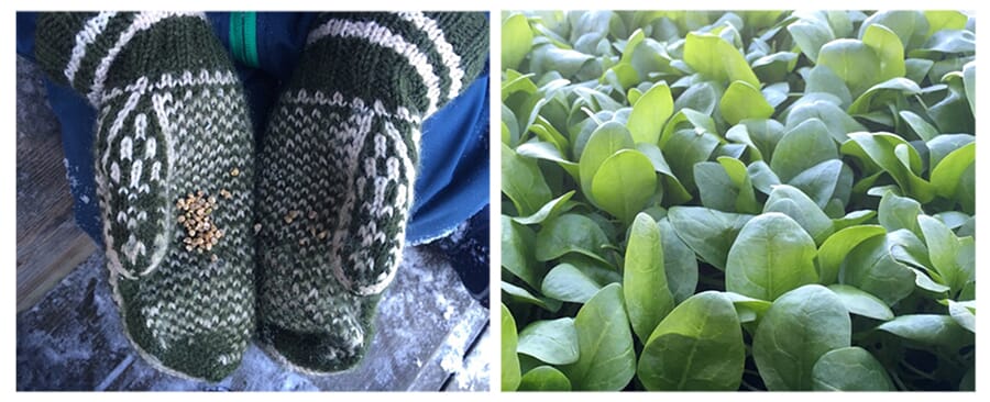 Midt i november sådde vi flere typer frø som tåler å overvintre ute for å kunne gi tidlig avling på våren. Deriblant favoritten spinat. Men desember ble mild det året, og spinaten ble lurt til å spire. Spirene på bildet har trosset flere kuldegrader allerede, men bukket under i sprengkulden i januar.