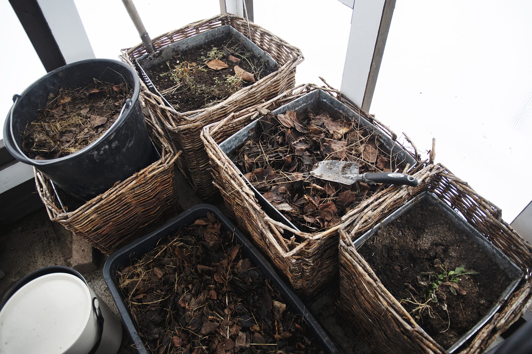 Her har vi vintersådd spinat på toppen av jordfabrikker i baljer, med netting på toppen som skadedyrbeskyttelse i tilfelle vi får besøk av vånd. Men altså ingen snø på toppen!