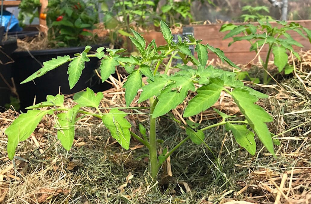 De vintersådde tomatplantene har ikke behøvd noe topping, og de er ikke blitt det minste strantete. De er faktisk våre fineste tomatplanter. Lubne og kraftige – helt uten stell!