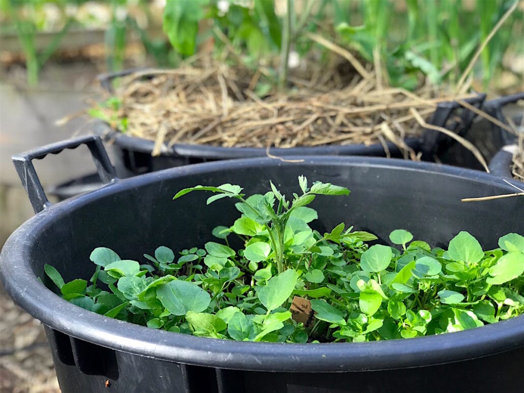 Men nå går det plutselig unna! Bare en uke senere potter vi om spirene. Til ganske små potter, med litt bokashijord i bunnen. De små plantene rekker også å få en runde vanning med bokashi gjødselvæske før vi setter dem ut på sine endelige vekstplasser under den store plantesjauen etter 17. mai.