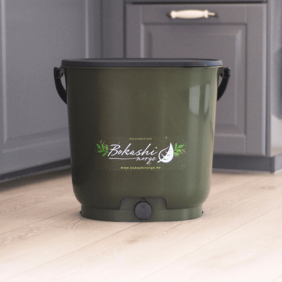 Bokashibøtta inneholder lokk, rist og tappekran. Den er produsert i Europa og laget av 100% resirkulert husholdningsplast.