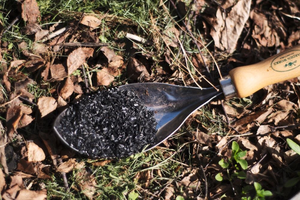 Skal du ha kull i jorda er det lurt å knuse det godt, slik slipper du å ha store kullbiter i jorden for resten av livet. Kull brytes ned laaaangsomt, det kan ta flere hundre år, og det er jo bra når det er fulladet med bokashivæske. Da avgir det væske og næring til jorden lenge, samtidig som det forbedrer jordstrukturen. Vi har også lest at evnen til å ta opp væske ofte forbedres når store biter knuses. Men merk altså at sugeevnen til kull kan variere en del, avhengig av både porestørrelsen og fuktighetsnivået i kullet.