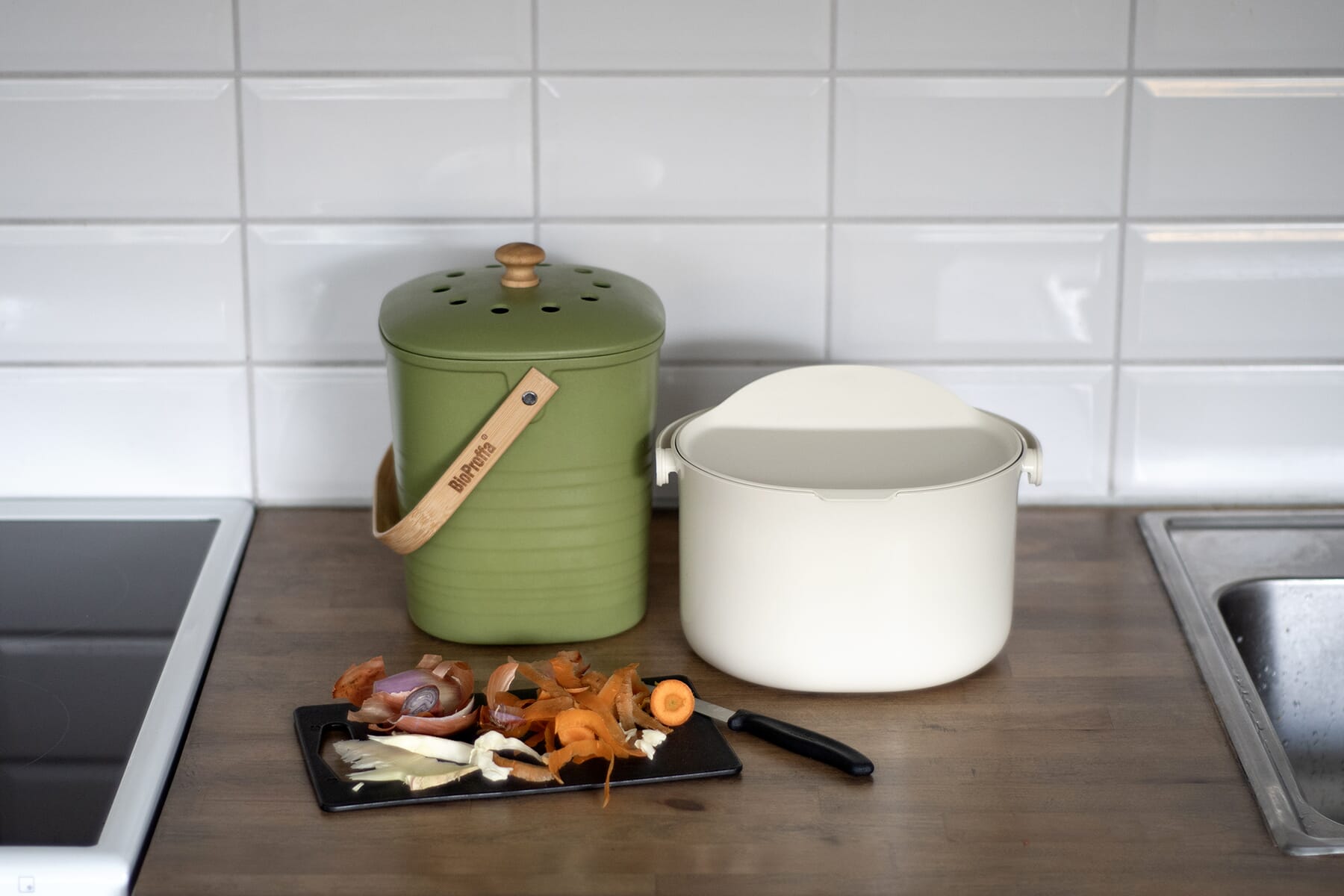 Å mellomlagre matavfallet i en mindre beholder gjør arbeidsflyten bedre i hverdagen. Vi svipper alt av småbiter, avskjær og rester vi ikke ønsker å ta vare på over i avfallsbøtta. Noen dager blir den full, andre ganger er den helt tom – men som regel blir det litt potetskrell, en epleskrott og et kvart knekkebrødhjørne fra barnas matpakke.