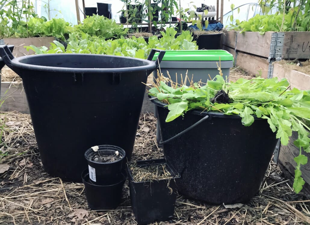 Vi benytter alltid også anledningen til å bli kvitt hageavfall og annet rusk og rask som kan bli jord med tiden, når vi lager kompostjord i krukkene: tjuver fra tomatplantene, visne blomster og andre planterester hiver vi i bunnen av krukkene. Der blir det prima jord til slutt (selv om det nok tar lengre tid enn med den fermenterte bokashien) og vi slipper å lagre det andre steder.