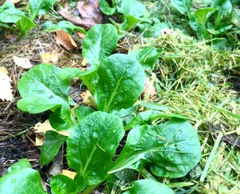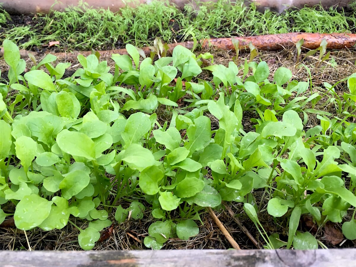 I september bredsår vi gjerne en pallekarm med en blanding av alle bladvekstene vi sådde på hver sine vokseplasser i august: Ruccola, bataviasalat, pak choi, beter, spinat og vintersalat. Det vi sår i september, blir neppe veldig store planter, men alt smaker kjempegodt som småblader i salater. I drivhustunnelen sår vi også spinat og salat for å forsøke å overvintre dem som småplanter. Da har de et forsprang når lyset kommer tilbake i midten av februar, og kan gi tidlig bladgrønt neste år. Litt lenger utpå høsten legger vi fiberduk over plantene, samt et lokk av plast eller glass for å beskytte mot nattefrosten. Sommer’n varer lenge i kaldbenk! Når september blir oktober, består salatbaren ute i kjøkkenhagen av beteblader, vintersalat/feldsalat, brønnkarse, bataviasalat, ruccola og spinat.