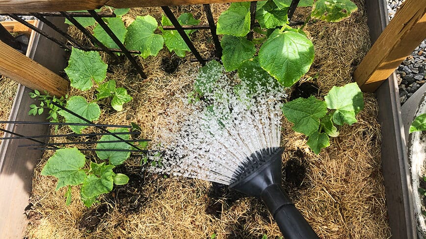 I tillegg til brønn og hardt arbeid er organisk materiale i jorden og tykke jorddekker våre viktigste våpendragere i kampen mot tørken. Og så har vi begynt å vanne på en bestemt måte, for å ta best mulig vare på de verdifulle vanndråpene.